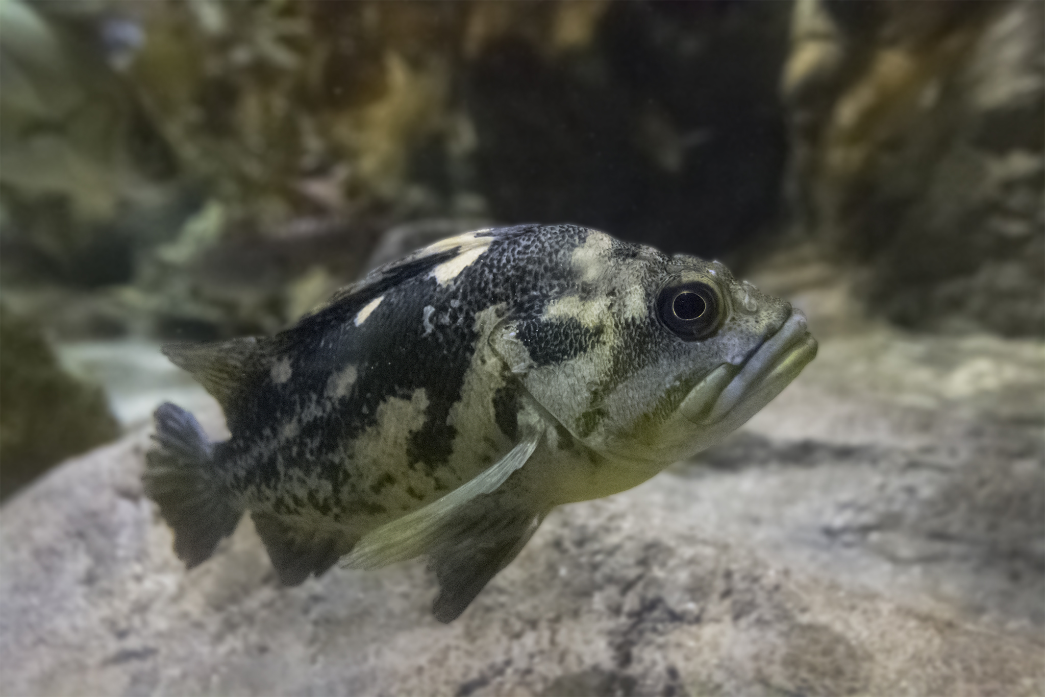 As their name suggests, this rockfish has a black body with yellow blotches and spotting on its back, lateral line, and lower sides. The underbelly is pale.