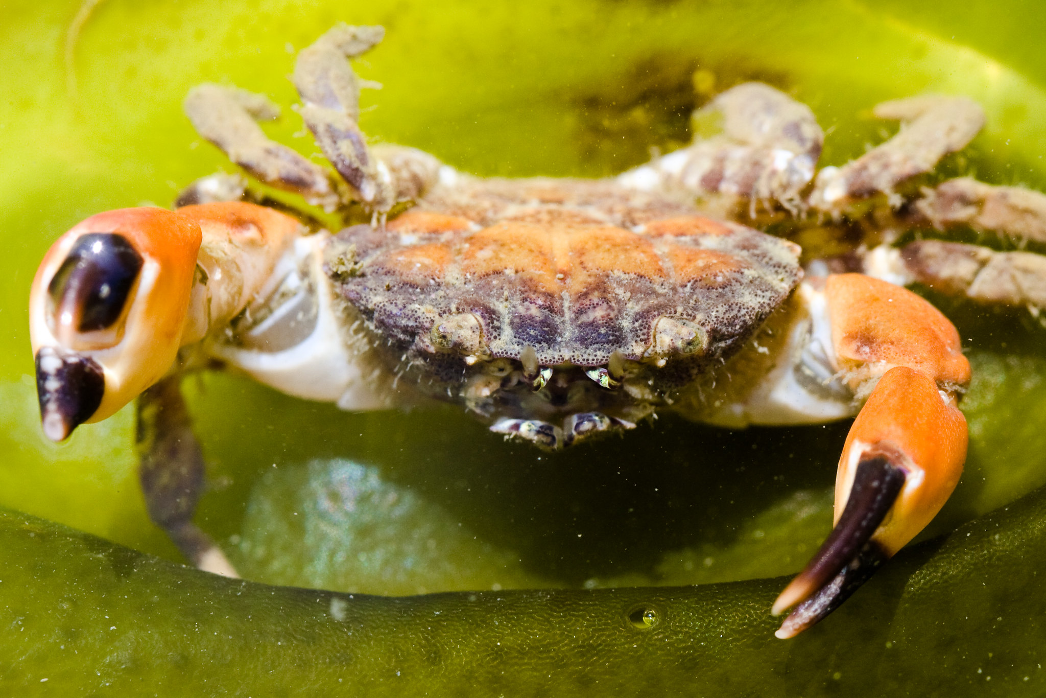 They have ten visible legs, with black-tipped claws/chela that are ideal for breaking-shells. The carapace color can be red, orange, green, purple, brown, gray, creamy white, or calico patterned. There are three ‘teeth’ or points at the front corner on each side of the carapace next to the eyes.