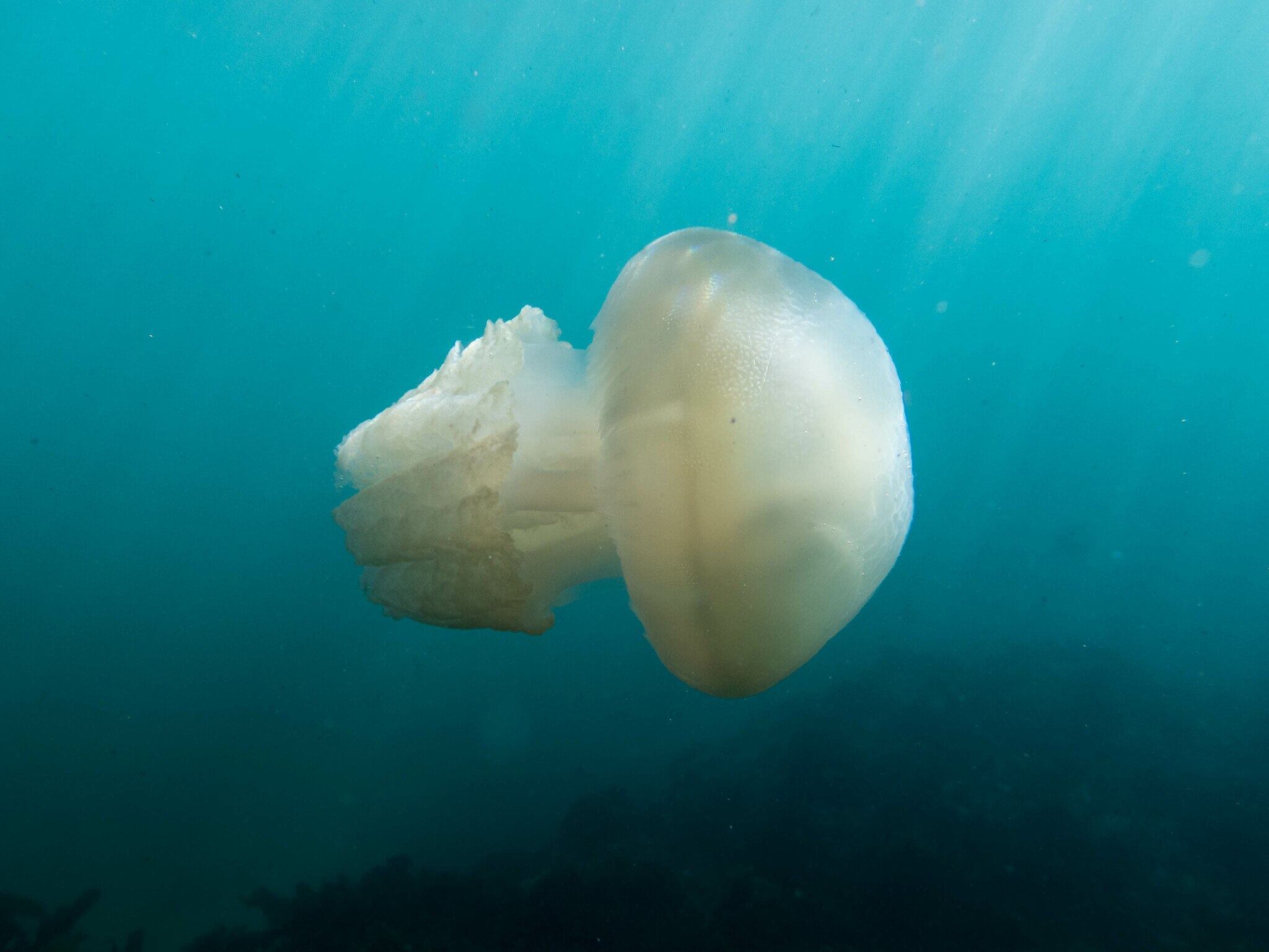 The mushroom-shaped bell can come in a variety of colors including blue, creamy white, and brownish-yellow. There are 8 oral arms hanging from the center of the bell underside.