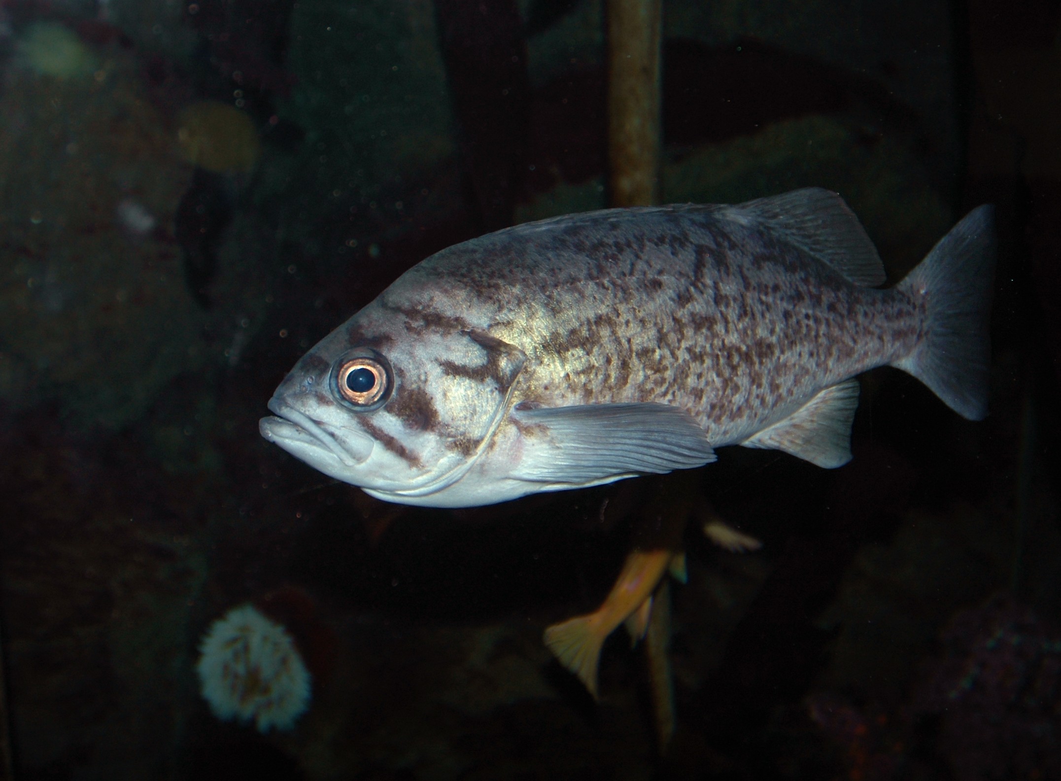 Predators include other rockfish species (gopher, kelp, and olive), kelp greenlings, lingcod, pigeon guillemots, and California sea lions.
