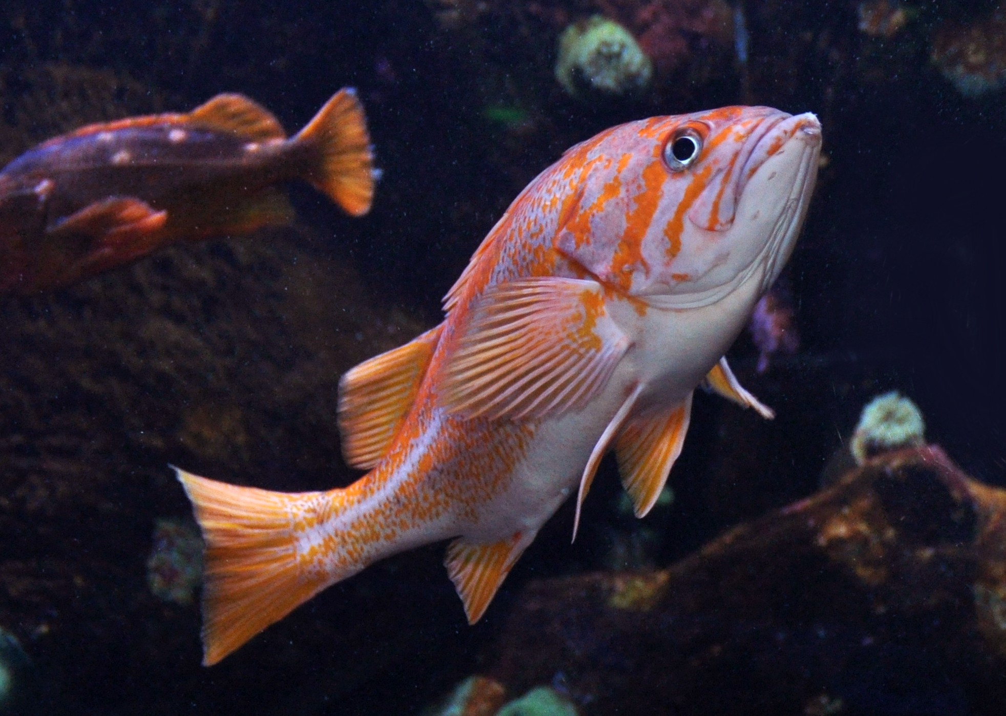 Canary rockfish are bright yellowish orange with mottling above and gray underneath. They have three orange stripes across the head, and orange fins. Their tail fin is forked and their lateral line is white.