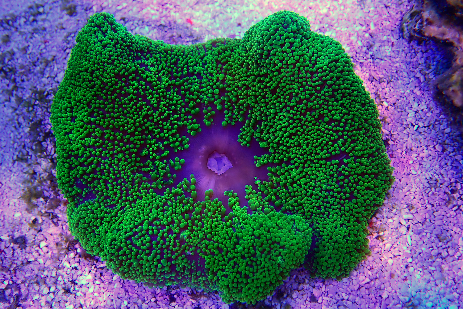 The carpet anemone varies in color from deep purple, green, pastel blue, grey and tan.