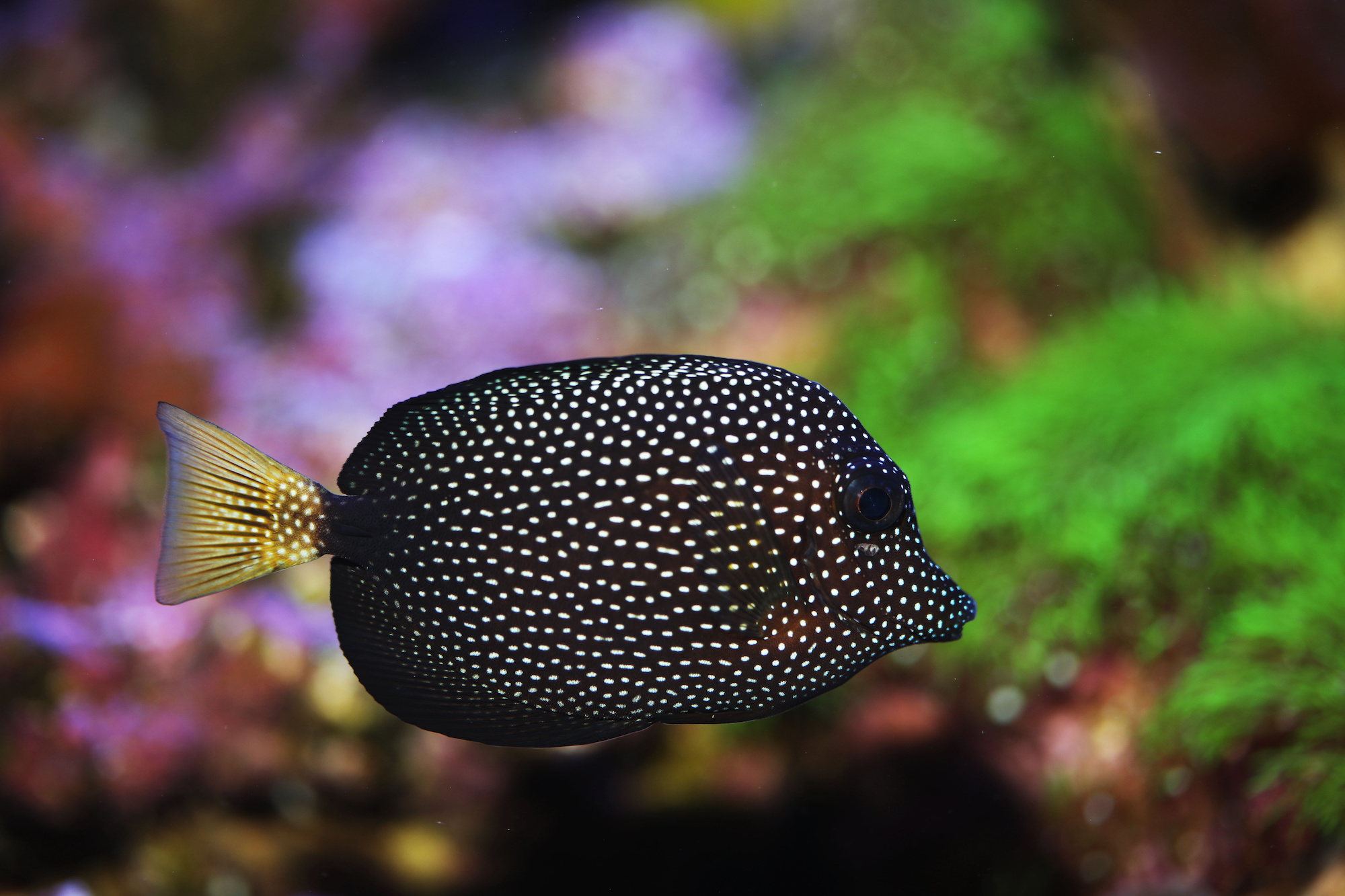 Gem tangs are dark brown and speckled with small white spots. There are also spots on their yellow caudal fin. As a member of the genus Zebrasoma, its dorsal and anal fins are much more developed than those of other tangs and surgeonfishes.
