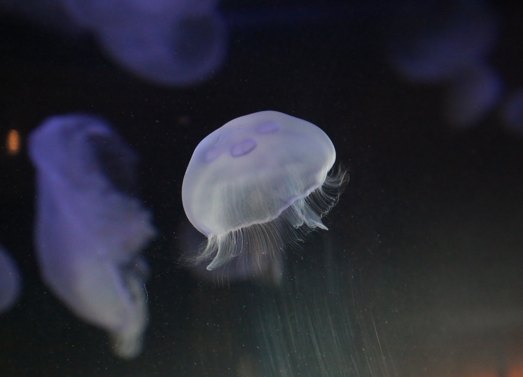 Moon jellies have transparent outer bells that surround an inner bell with a blue to clear tint and covered in blue veins. Small tentacles hang from beneath the inner bell, as well as four oral arms which contain stinging cells.