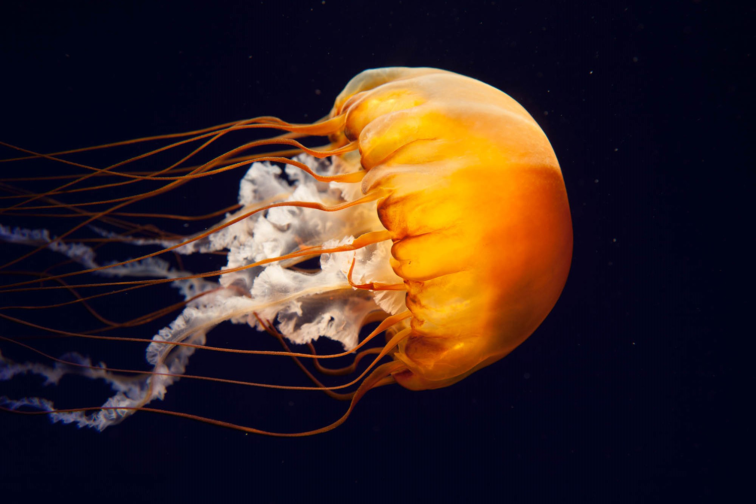 Tiny animals, like juvenile crabs and small fish, hide in the folds of the jelly, hitching a ride and eating the food particles captured on the tentacles