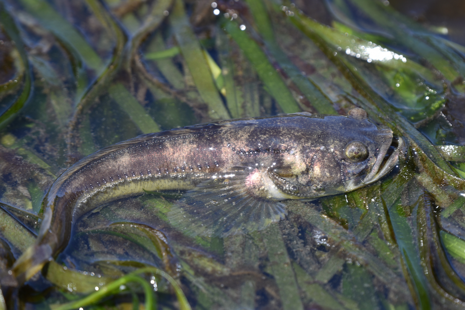 Spawn at night in spring and summer. There are 2 different types of male plainfin midshipman: type I males are much larger and they make and guard nests in sandy or muddy bottoms near rocky areas in shallow waters. The male uses his fins or mouth to scoop out a hollow. Type I males make 3 different kinds of sounds: hums, grunts, and growls. The hum is used to attract females, while a male will grunt at any intruders while guarding his nest. Type II males are smaller, sneakier males. Rather than make their own nest to guard, their reproductive strategy is to sneak into a Type 1 male’s nest and release sperm. Along with females, Type II males can only make growls, but not the hums or grunts that Type I males make. During the spawning season, Type 1 males start humming shortly after dusk, humming for as long as 14 minutes. Attracted by the humming, a female will enter the male’s nest, and he will stop humming. She will spend up to 20 hours laying her sticky 70-200 eggs in his nest. He fertilizes them as she lays them and when she’s done, he kicks her out of the nest, and he starts humming again to attract more females, while caring for those eggs by brushing and fanning them. A single nest can contain 2,000 eggs from many females. During low tide, when the eggs are exposed to the air, the male will splash them to keep the eggs moist. It takes 40-45 days for the eggs to hatch. The juveniles hatch at 0.2 or 0.3 inches long but stay attached to the rocks for weeks, until they reach 0.6-0.7 inches long. Once they are free-swimming, they stay in shallow waters, either on sand or eelgrass, burying into the sand during the day and coming out at night to feed.