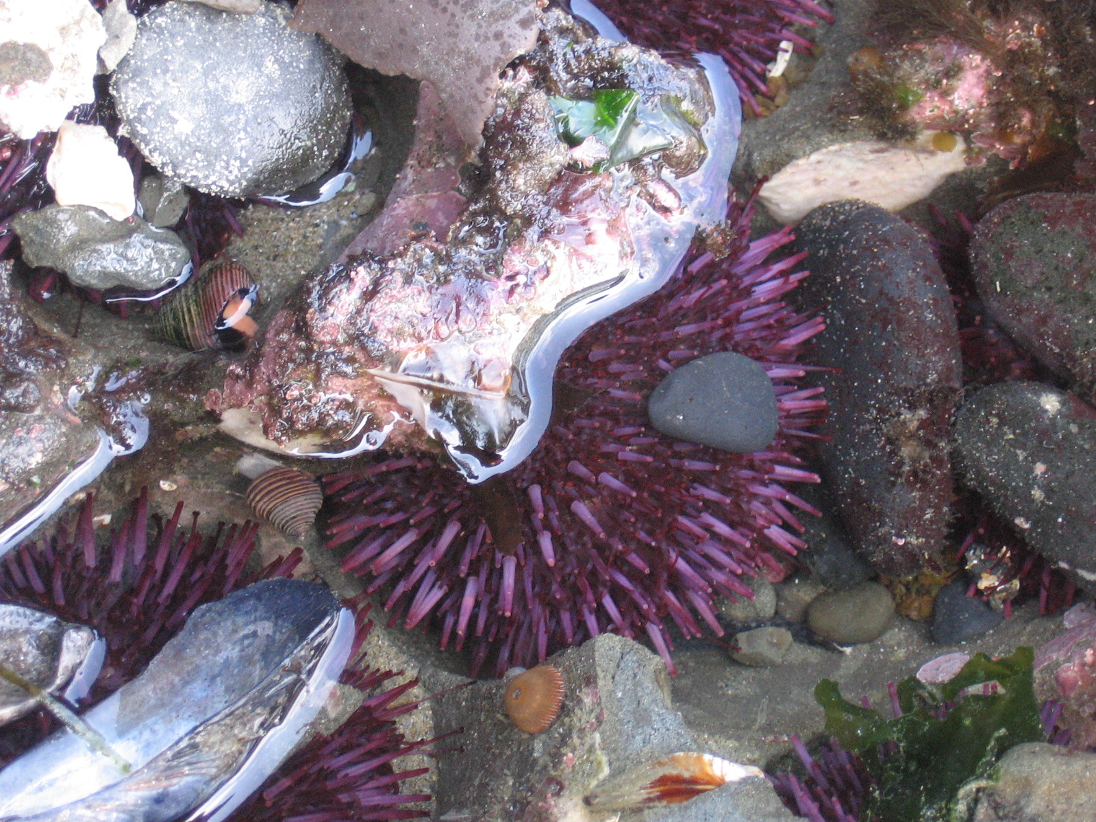 In the intertidal, urchins may “decorate” themselves with shells, rocks, or algae, likely for protection from sun and predators.