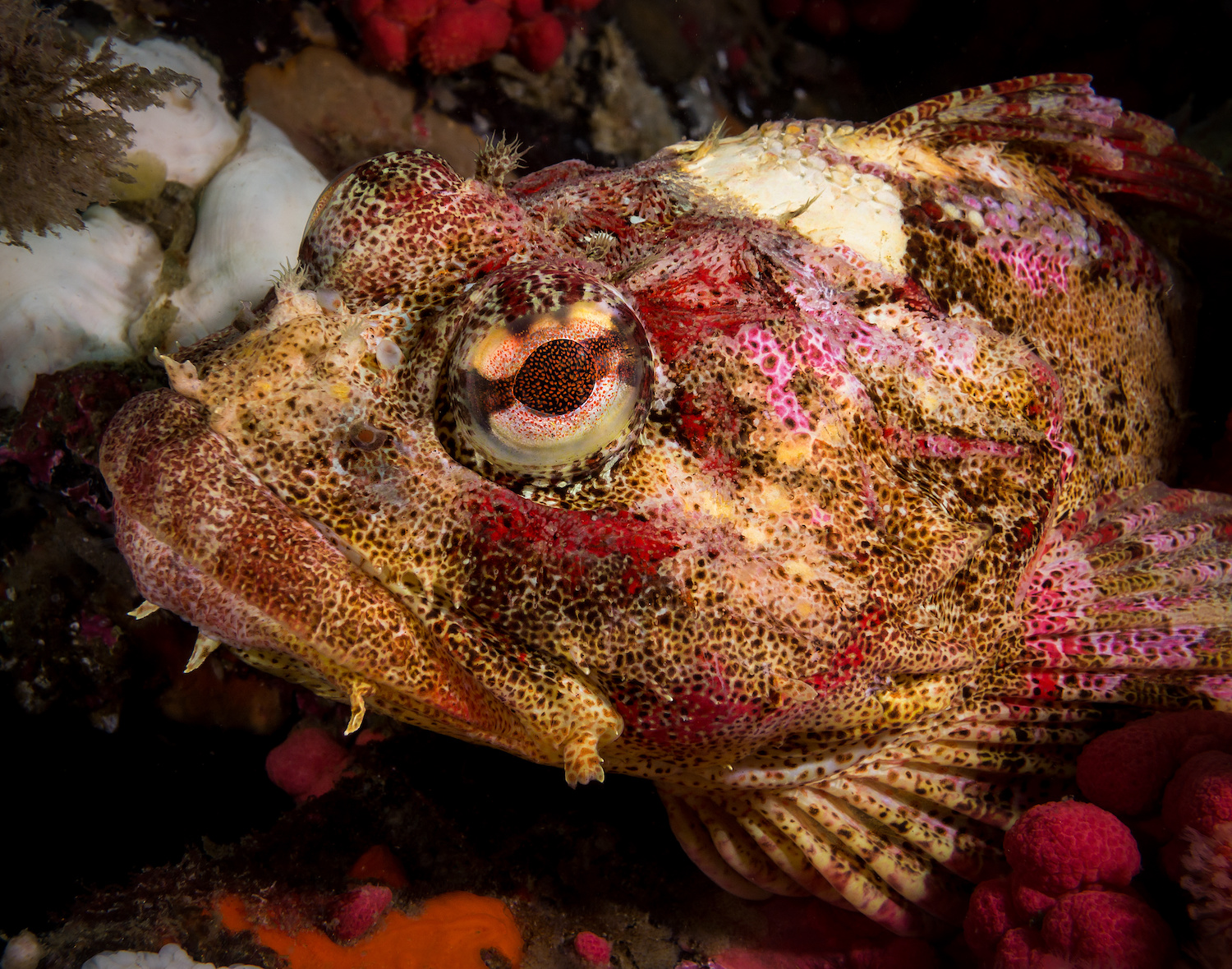 Red Irish lords have large heads and eyes. They come in a variety of colors, often mostly red with a mix of black, white, and brown mottling. Males have black and white pelvic fins while those of females are all white. They have a band of scales above the lateral line and another band of scales below the lateral line.