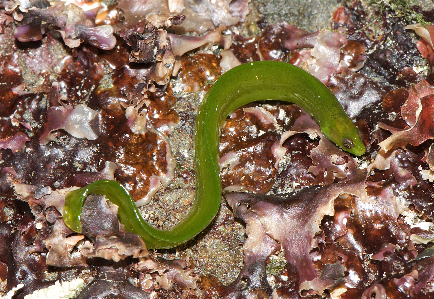 These long, skinny fish can be yellow-brown, red, or green in color. They lack pelvic fins and have tiny pectoral fins. They have a dark stripe below the eye.