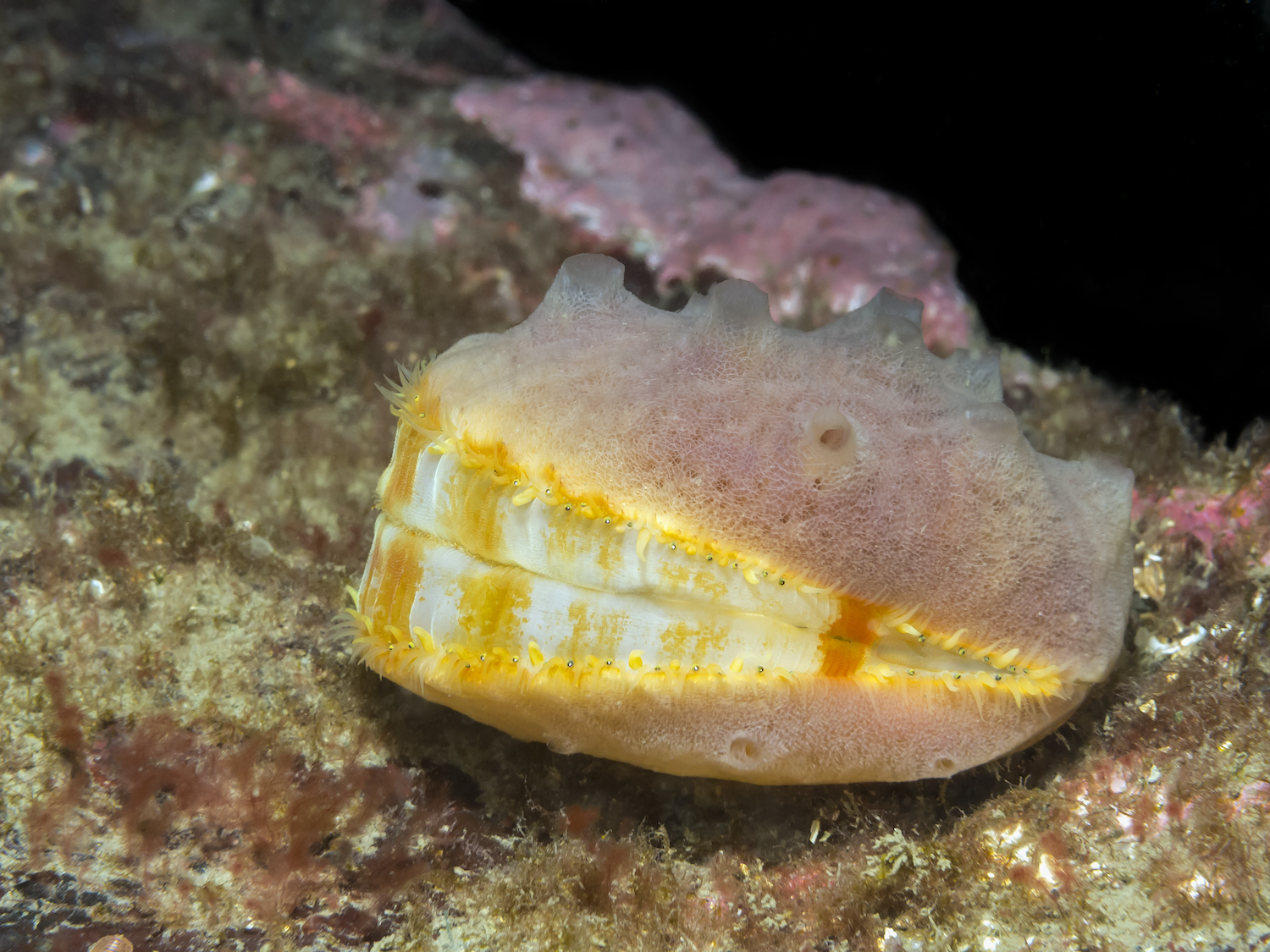 The shells of spiny pink scallops are ribbed with spines and can reach up to 2.4 inches across. The mantle edge has many small tentacles and tiny blue eyes for detecting light.