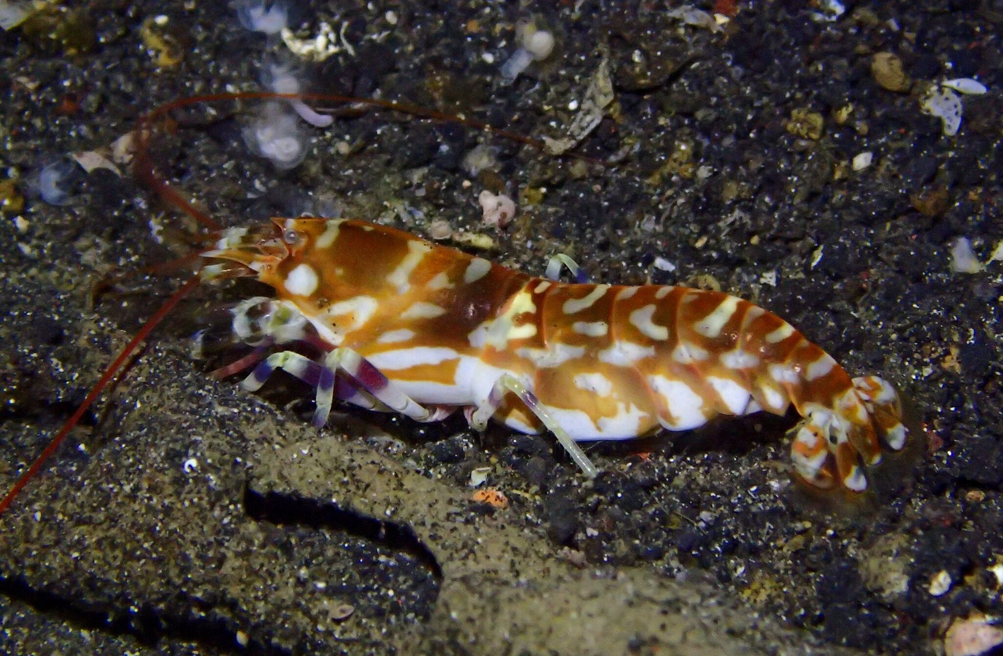 The body of the tiger pistol shrimp is white with reddish brown netlike pattern. Their legs and chelipeds, which are claw-like appendages, are banded white and brown.