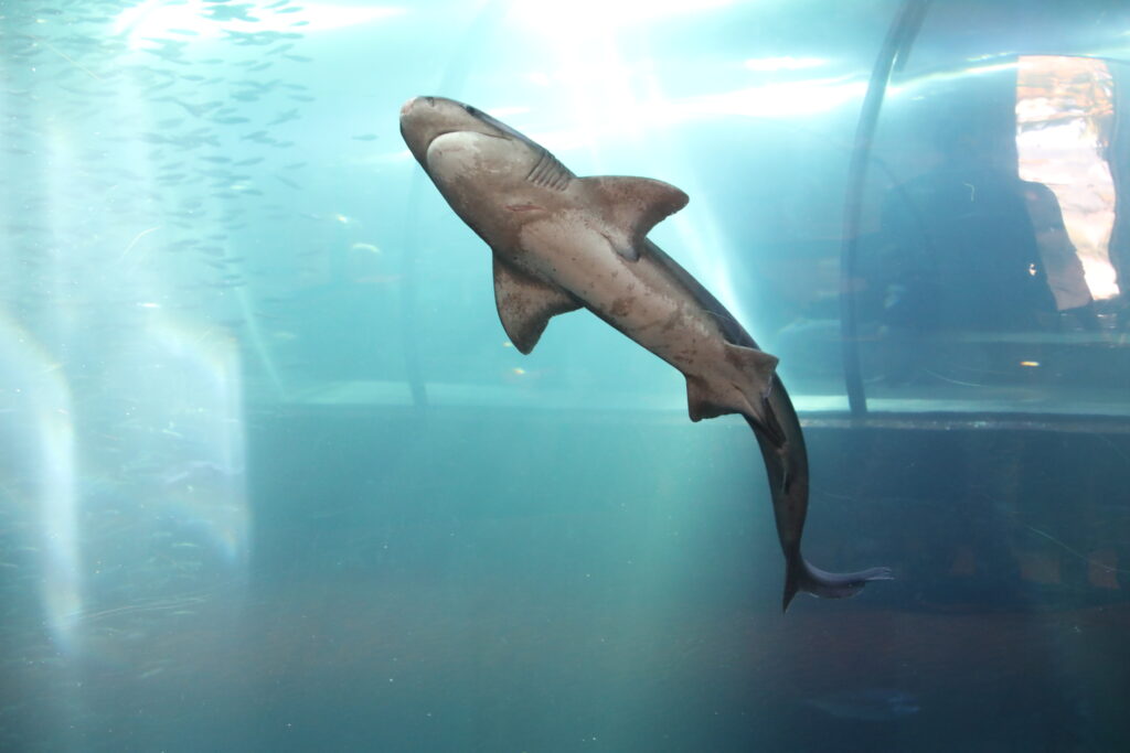 The longest tunnel in Passages of the Deep also represents the world’s largest environment – the Open Sea. There are no towering kelp forests or narrow rocky channels here… just water as far as the eye can see. Most of the species represented in this exhibit live in the upper strata of water, commonly referred to as the Sunlit Zone. This area is alive with four species of shark, huge bat rays and great schools of anchovy and mackerel. The sharks are particularly popular with Aquarium visitors and all our species are native to Oregon coastal waters, including our largest specimen, the Broadnose Sevengill Shark.