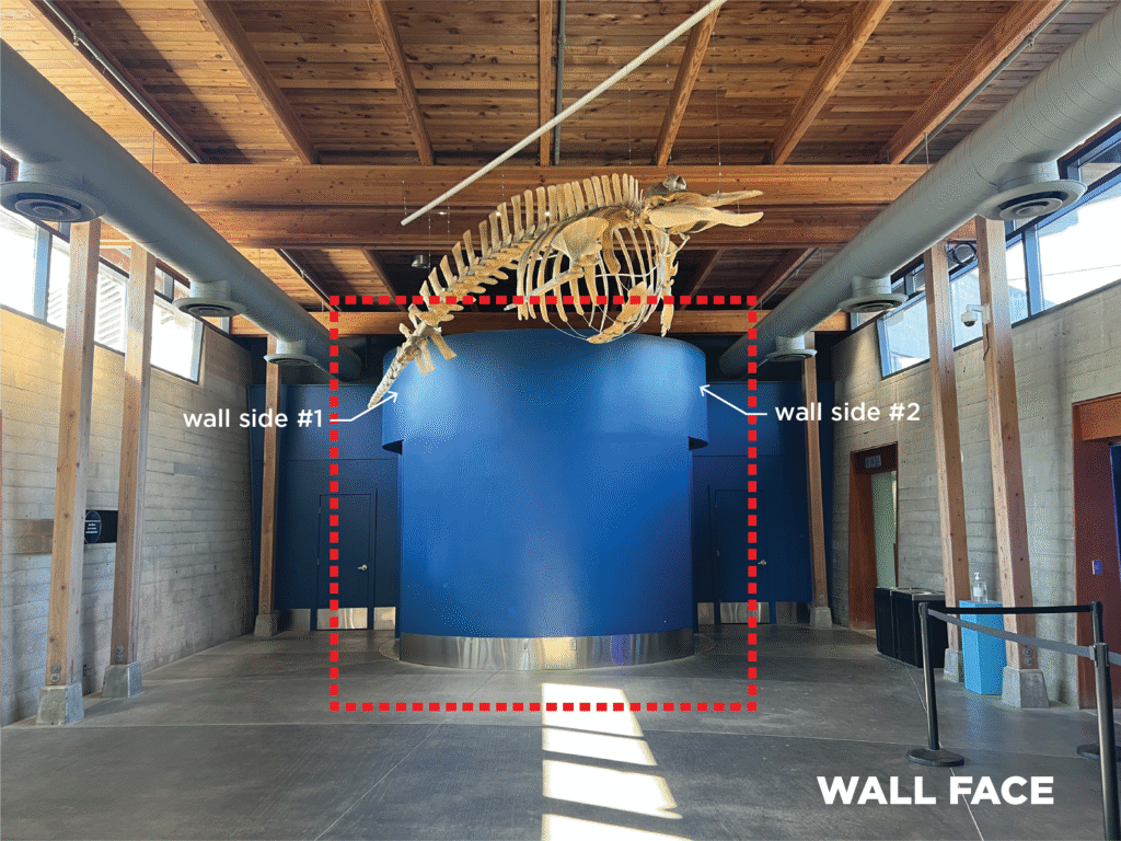 In the past, the Aquarium has had a large set of prop megalodon shark jaws in front of this wall. Previous artwork on this wall has shown a forced perspective of a megalodon shark with its mouth open, to spatially align with the prop jaws (see final page of this PDF for images). We are planning to relocate the same megalodon prop jaws in front of this wall, in the same position, again. So, any proposed artwork should take that into account.