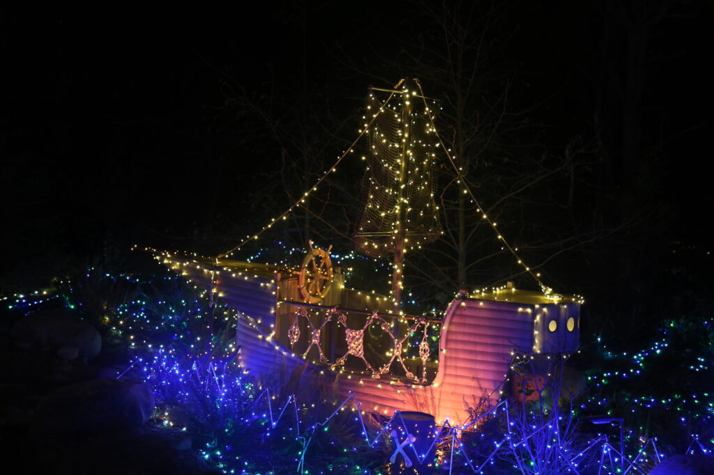 A wooden sailboat at a jaunty angle, various twinkle lights adorning the mast and railing.